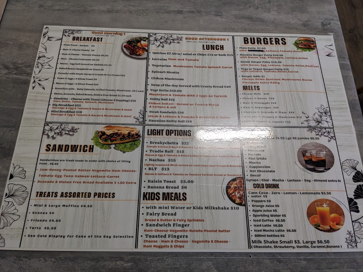The menu spans an impressive array of options that cater to all cravings. Whether you're in the mood for a hearty Plain Patty Burger at A$7.50 or treating yourself to an indulgent Hawaiian Burger Patty at A$10.50, you'll find burgers that stand out with their juicy patties and fresh ingredients. The Melts section is particularly enticing; try the Cheese & Bacon Melt for A$12.00, delivering a satisfying crunch and savory richness that pairs perfectly with their gourmet coffee. Not to be missed are fragrant offerings like the Soup of the Day, served with crusty bread for just A$10.00, inviting you to warm up on cooler days.